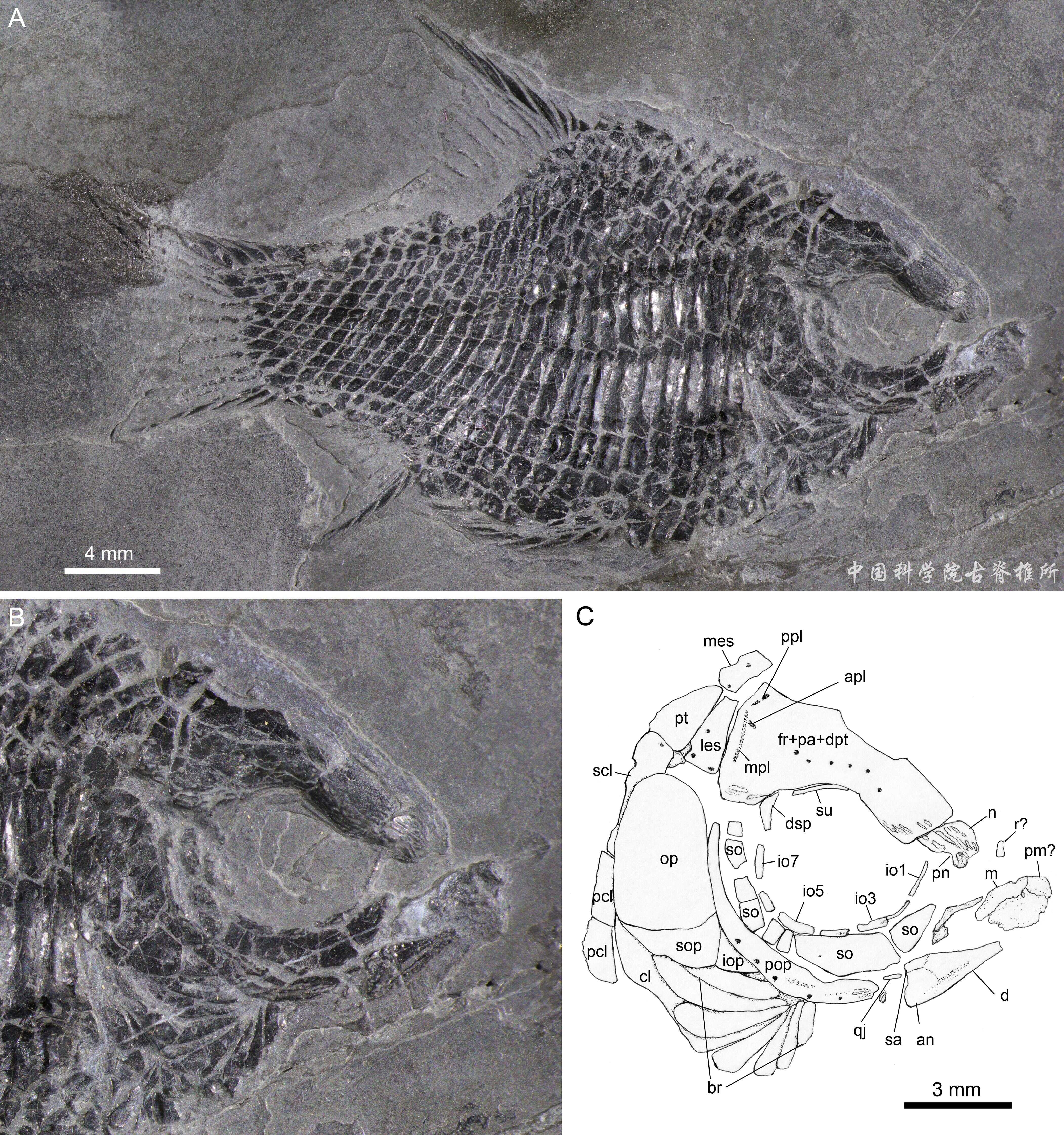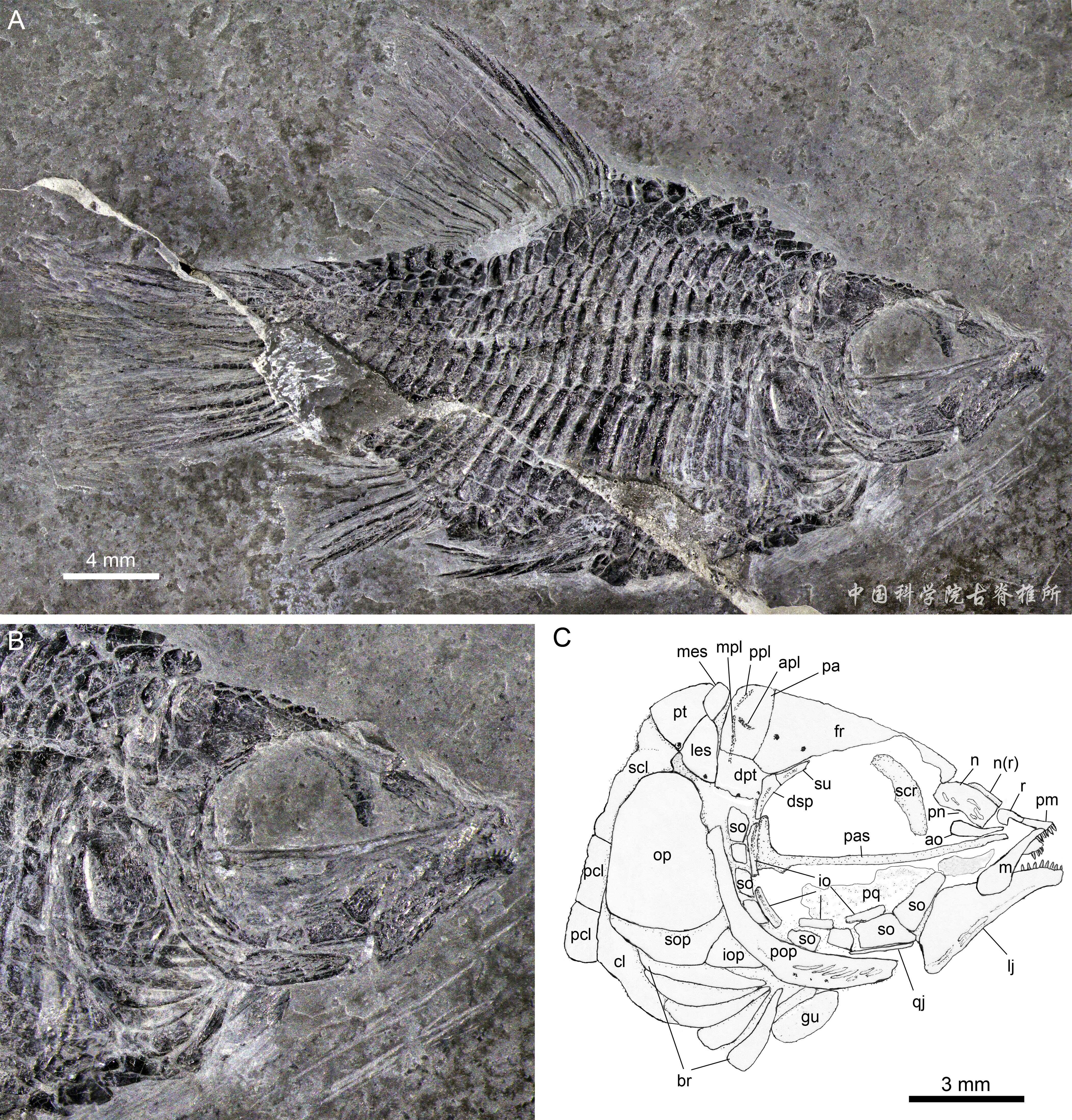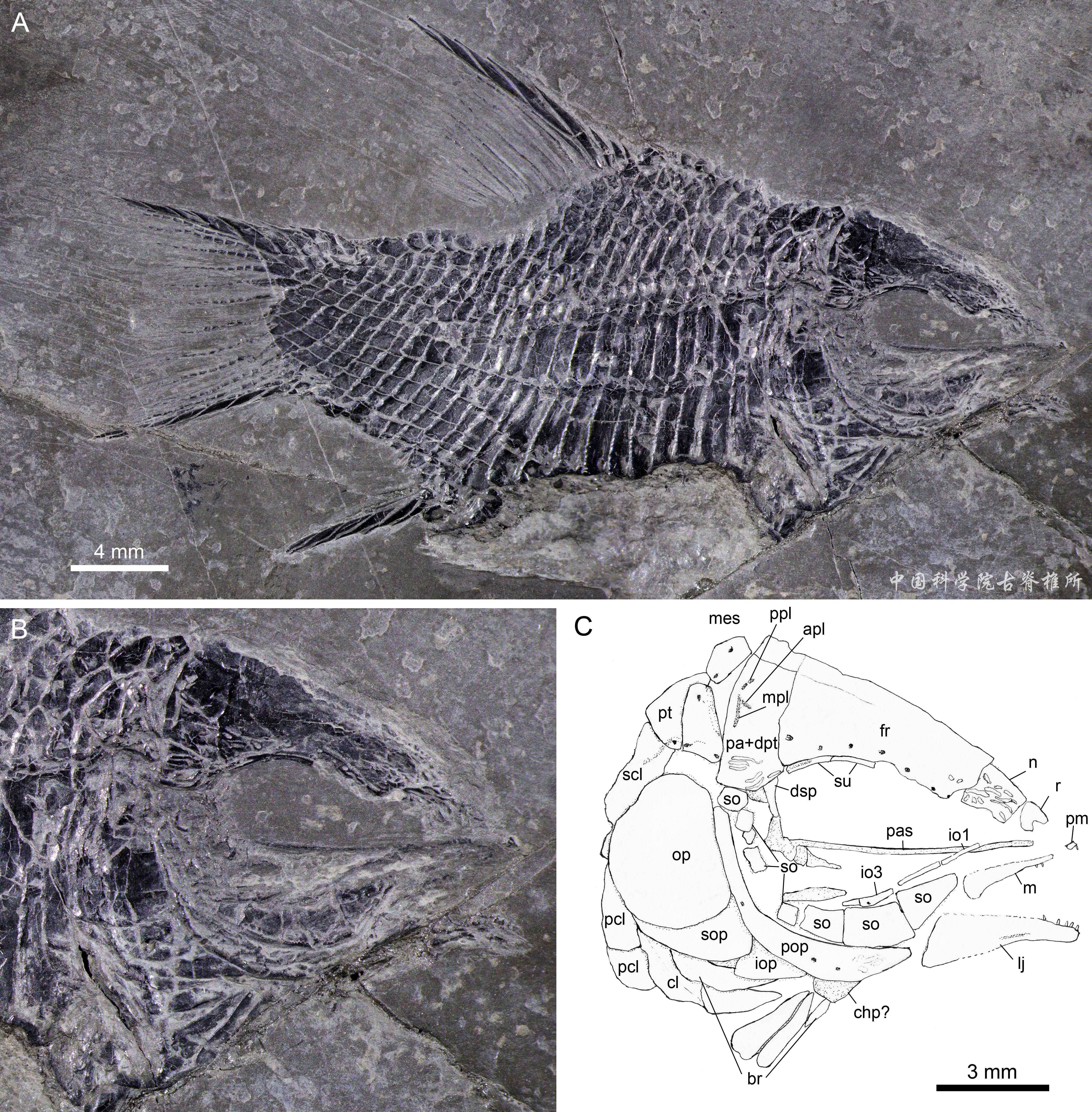 自2003年命名以來,小貴州短體魚(Guizhoubrachysomus minor)被認為是盧加諾魚科成員,唯一的一塊模式標本保存于中國科學院南京地質古生物研究所。早在2017年徐光輝到南京觀察該標本時就發(fā)現(xiàn)它頭骨前部保存欠佳,其體型和鰭條特征與盧加諾魚科顯著不同,因此對它的分類產生了懷疑。但限于小貴州短體魚化石稀少,重新研究難以實施。幸運的是,在過去的數(shù)年間,6塊新的小貴州短體魚化石在貴州興義和云南富源先后被發(fā)現(xiàn),為研究提供了前提條件。這些標本經專業(yè)化石修復師小心修理,現(xiàn)收藏于中國科學院古脊椎動物與古人類研究所標本館和山東博物館等國內多家單位。