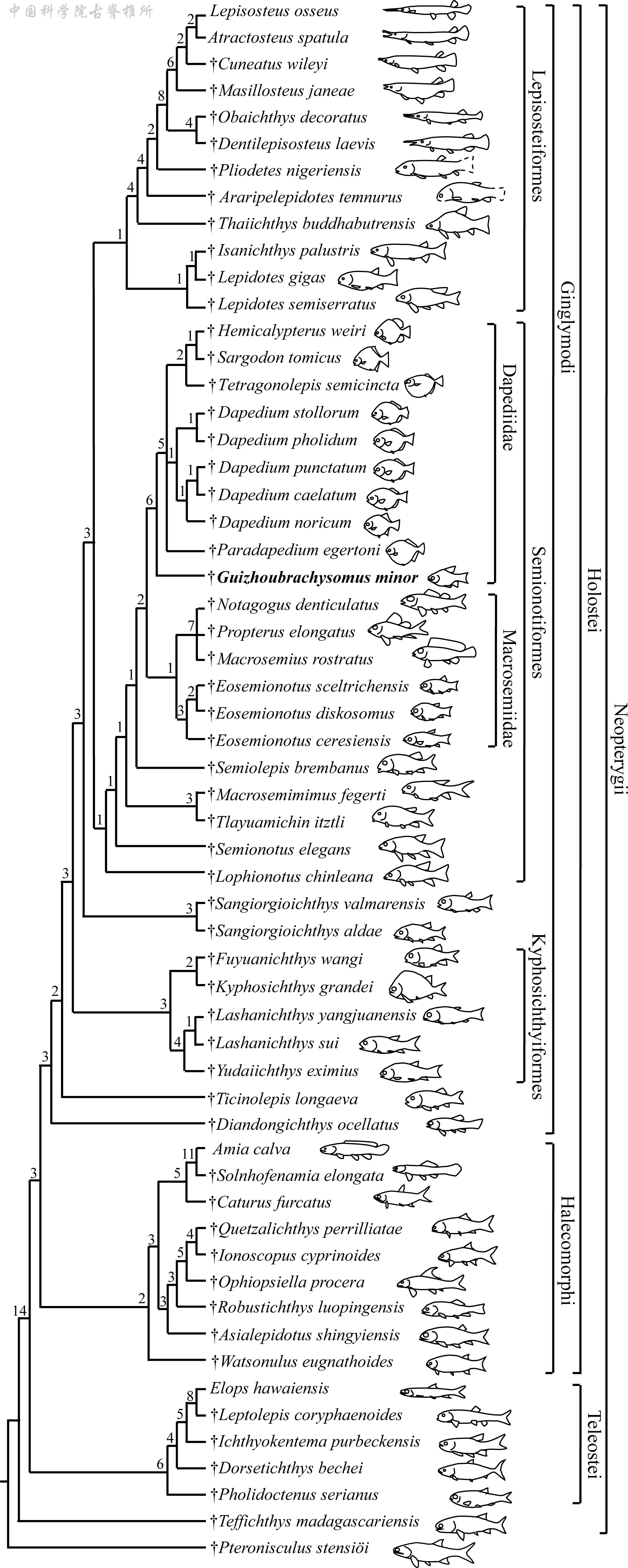 小貴州短體魚最大體長只有約4厘米,具有短而高的獨特體型,與興義生物群中的典型代表胡氏貴州龍、興義亞洲鱗齒魚和興義飛魚等共生?;瘜游坏牡刭|年代經牙形石生物地層對比和鋯石絕對年齡測定為距今約2.4億年?;谛碌臉吮?,徐光輝等重建了小貴州短體魚的頭骨和肩帶特征,并依據(jù)這些新的解剖學特征,首次將它納入分支系統(tǒng)學研究中。研究結果表明,小貴州短體魚不是古鱈目盧加諾魚科成員而是鉸齒魚類半椎魚目平體魚科(Dapediidae)最原始的成員。小貴州短體魚代表了平體魚科在中國的首次發(fā)現(xiàn),它的重新分類為研究平體魚科的起源和演化提供了重要的證據(jù)。