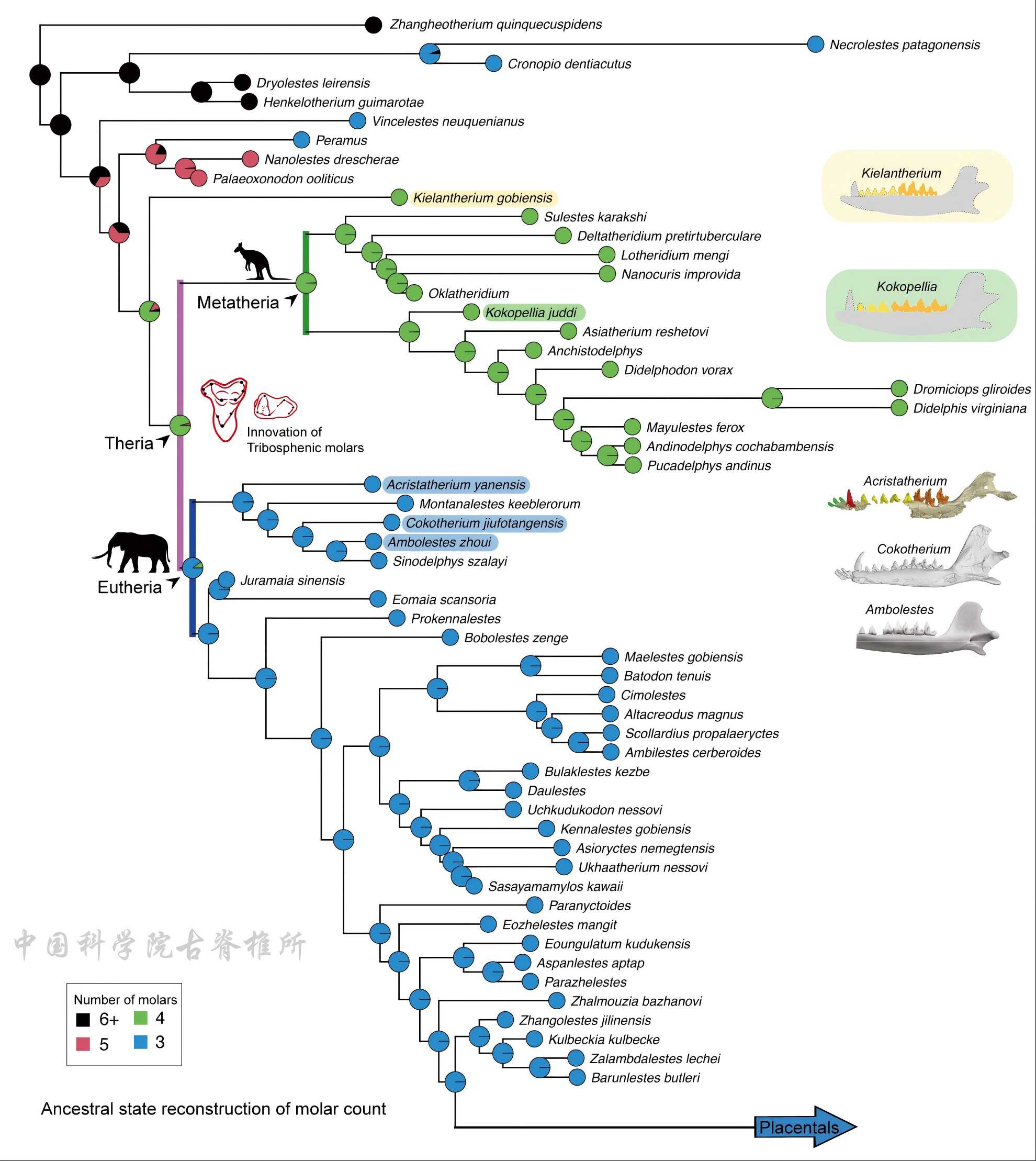 圖2. 早期獸類臼齒齒式祖先狀態(tài)重建