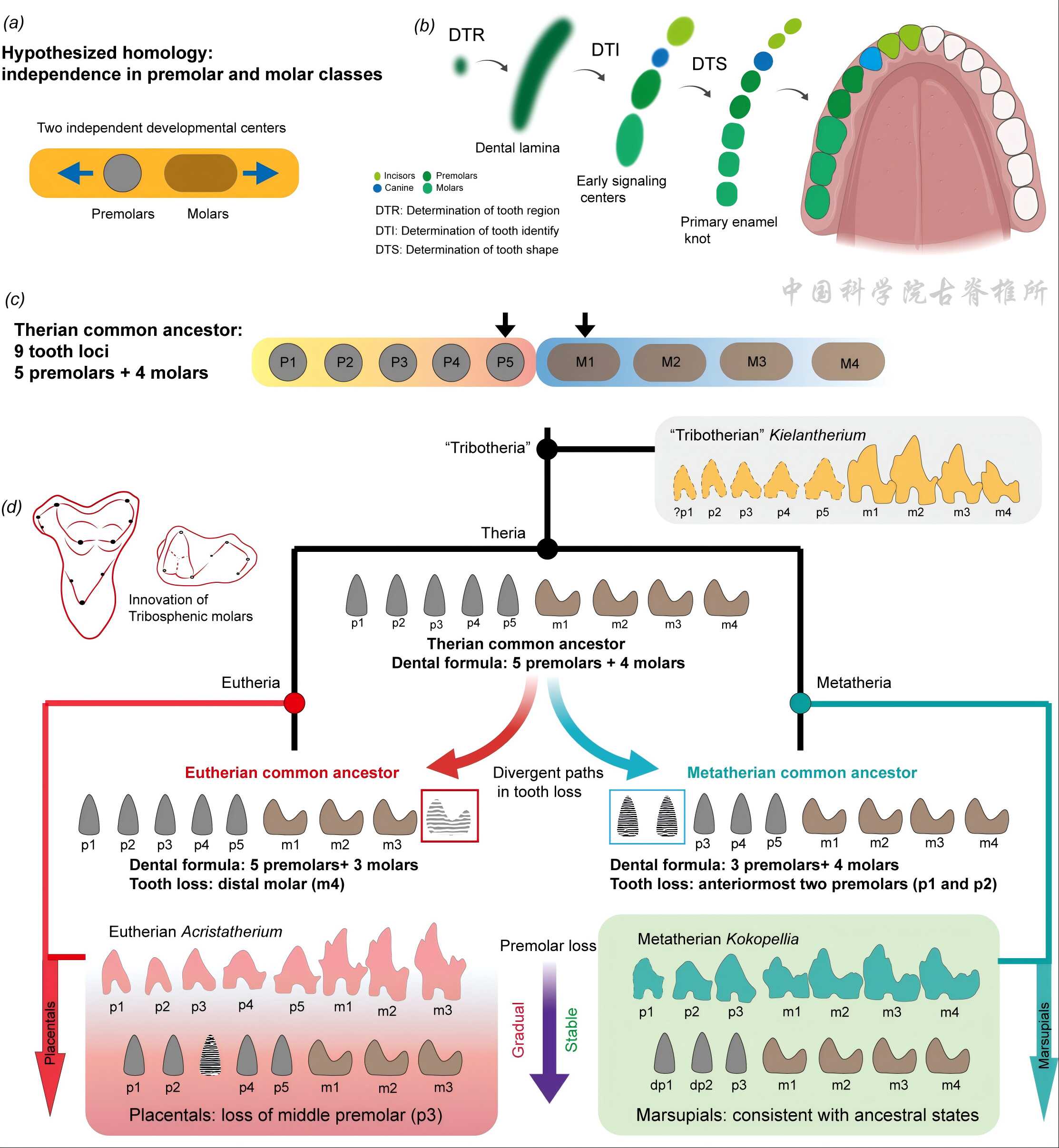 在現(xiàn)代獸類演化中,一個普遍的觀察是,牙齒數(shù)量減少比增加更加常見,但牙齒的替換模式與齒位的對應(yīng)關(guān)系相對穩(wěn)定。牙齒齒位、形態(tài)和數(shù)量對于討論真獸-后獸類起源是決定性的,但一直缺乏系統(tǒng)的定量研究?;谧钚碌南到y(tǒng)發(fā)育樹,團(tuán)隊對早期獸類的牙齒齒式進(jìn)行祖先狀態(tài)重建,結(jié)果顯示獸類(5P4M)、真獸類(5P3M)、后獸類(3P4M)三個節(jié)點(diǎn)的齒式各異,與目前較為流行的假說不同。在此基礎(chǔ)上,團(tuán)隊結(jié)合最新的哺乳動物牙齒演化發(fā)育證據(jù)提出的牙齒齒級(tooth class)發(fā)育及演化獨(dú)立性,即前臼齒和臼齒源自于兩個相對獨(dú)立的發(fā)育中心,進(jìn)一步建立獸類演化分異的新方案——“前臼齒-臼齒獨(dú)立演化” 假說:在獸類早期分化過程中,與其祖先相比,真獸類丟失了最后側(cè)一枚臼齒,保持前臼齒數(shù)量不變;后獸類保持臼齒數(shù)量不變,但在丟失了前側(cè)的兩枚前臼齒。