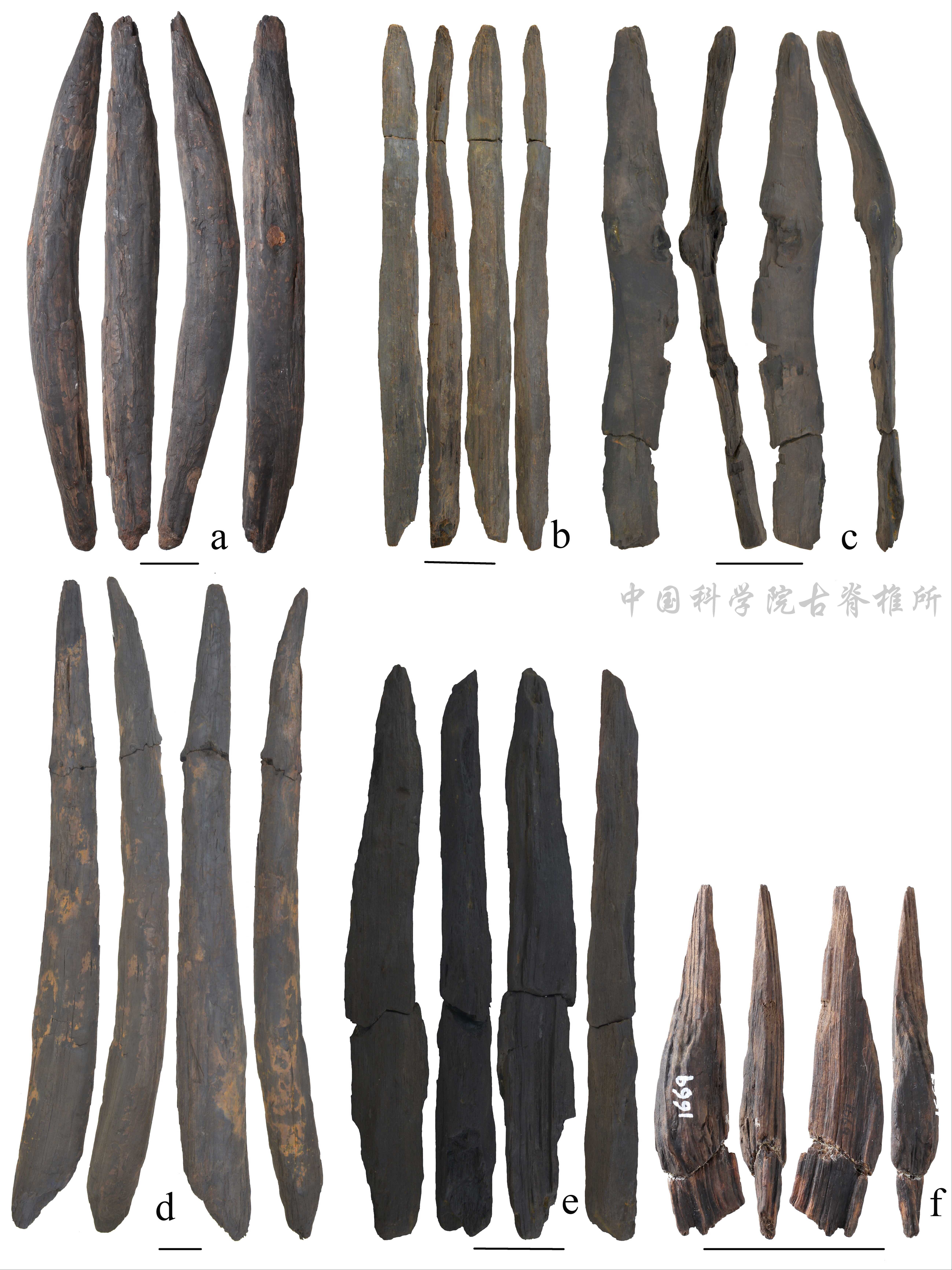 木質(zhì)材料會在埋藏過程中降解,痕跡變得模糊乃至消失。為論證這些木器的人工屬性及其功能,考古隊(duì)開展了材質(zhì)分析、痕跡分析、殘留物分析和實(shí)驗(yàn)?zāi)M等專項(xiàng)研究。木器主要用松木制作,宏觀和顯微觀察表明,一些標(biāo)本存在因砍枝修形削尖而留下的削刮痕,尖端存在因使用而產(chǎn)生的磨光條痕和斷裂破損。這些痕跡出現(xiàn)在特定部位并具有方向性,是人類加工與使用的證據(jù)。一些木器尖端保留土壤殘留物,包含植物淀粉粒,證明木器的主要功能是挖掘地下植物食材。實(shí)驗(yàn)?zāi)M成功復(fù)原了用石器加工木器并用來挖掘植物根莖的過程,輔證遺址出土的木器是人類制作和使用的工具。