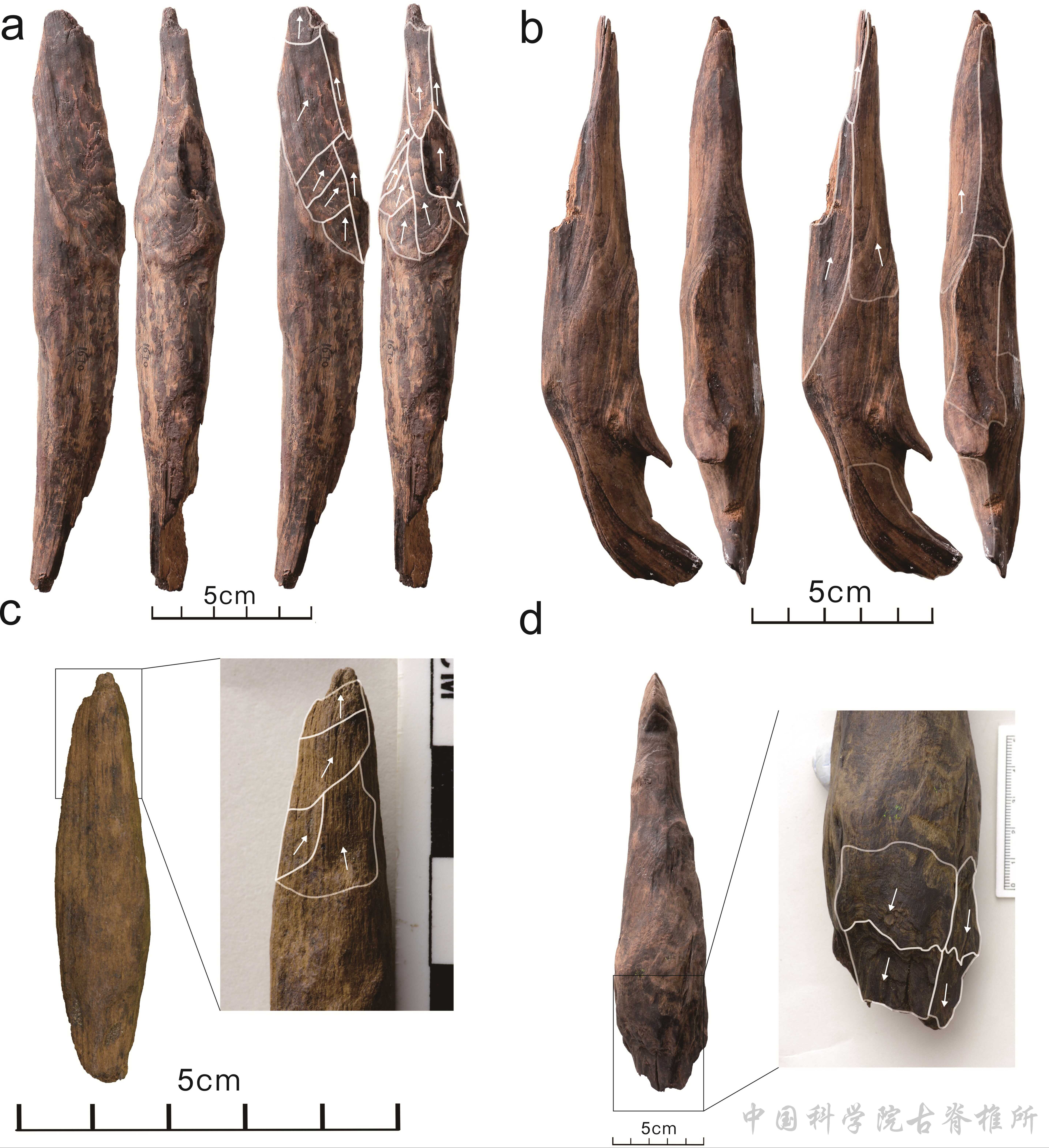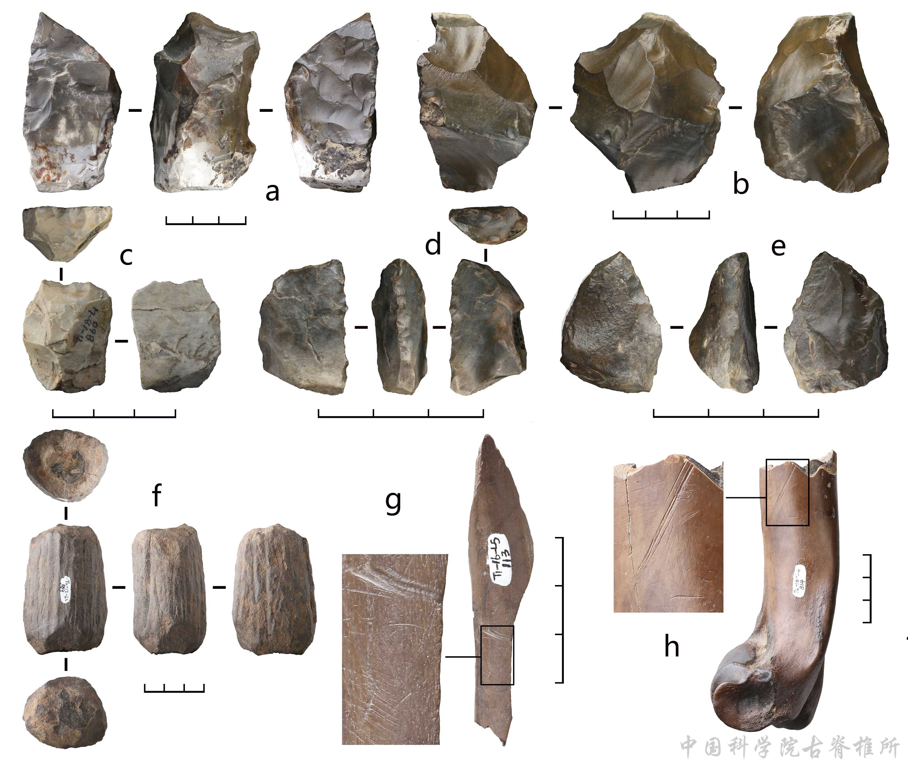 該遺址的石器以刮削器為大宗,個體都很小,是何成因?原料和技術(shù)分析解開了謎團(tuán)。遺址附近缺乏石器原料,只能在遠(yuǎn)處尋找石料,把加工成形且便攜的小型石器帶入遺址使用。木器的出現(xiàn),應(yīng)是遺址占居者因石料資源匱乏而用木質(zhì)工具取代石器功能的結(jié)果。這些石器被古人用來加工木器、肢解獵物,木器上的削刮痕跡和動物骨骼上的切割劃痕即為明證。石器外觀簡樸,但一些標(biāo)本的刃口保留精細(xì)加工的痕跡。4件用鹿角殘段制作的軟錘有明顯的使用痕跡。用軟錘打擊加工是石器技術(shù)發(fā)展成熟的重要標(biāo)志,表明舊石器時代早中期的東亞石器技術(shù)并非像早先認(rèn)為的那樣明顯落后于西方。